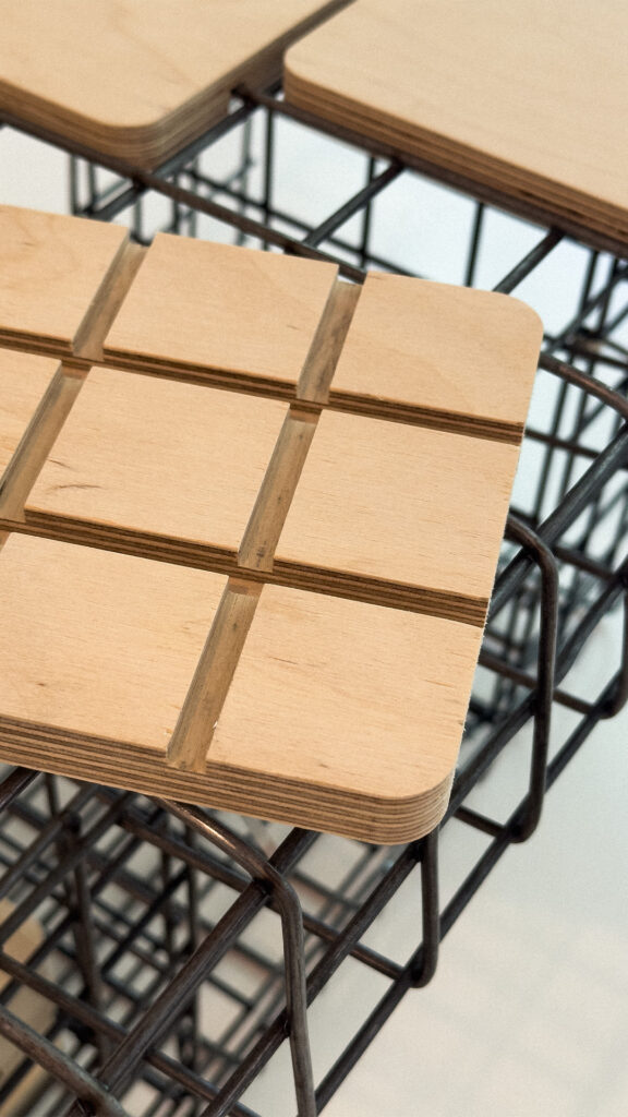 Plywood tiling of Mezze Coffee Table provides user with a way to play around with the top layout, adapting the table to the situation, creating a powerful play between the object, space and users.